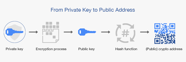 The first encryption process ECDSA generates the public key and the Hash function produces the address. The hash function takes a digital input of any size and transforms it into a fixed length string of numbers and letters that appear random. The resulting crypto address is the fingerprint of the public key. Bitcoin systems use the Secure Hash Algorithm, SHA256. In this case the crypto address text string has been converted into a QR code to be read by an optical scanner.