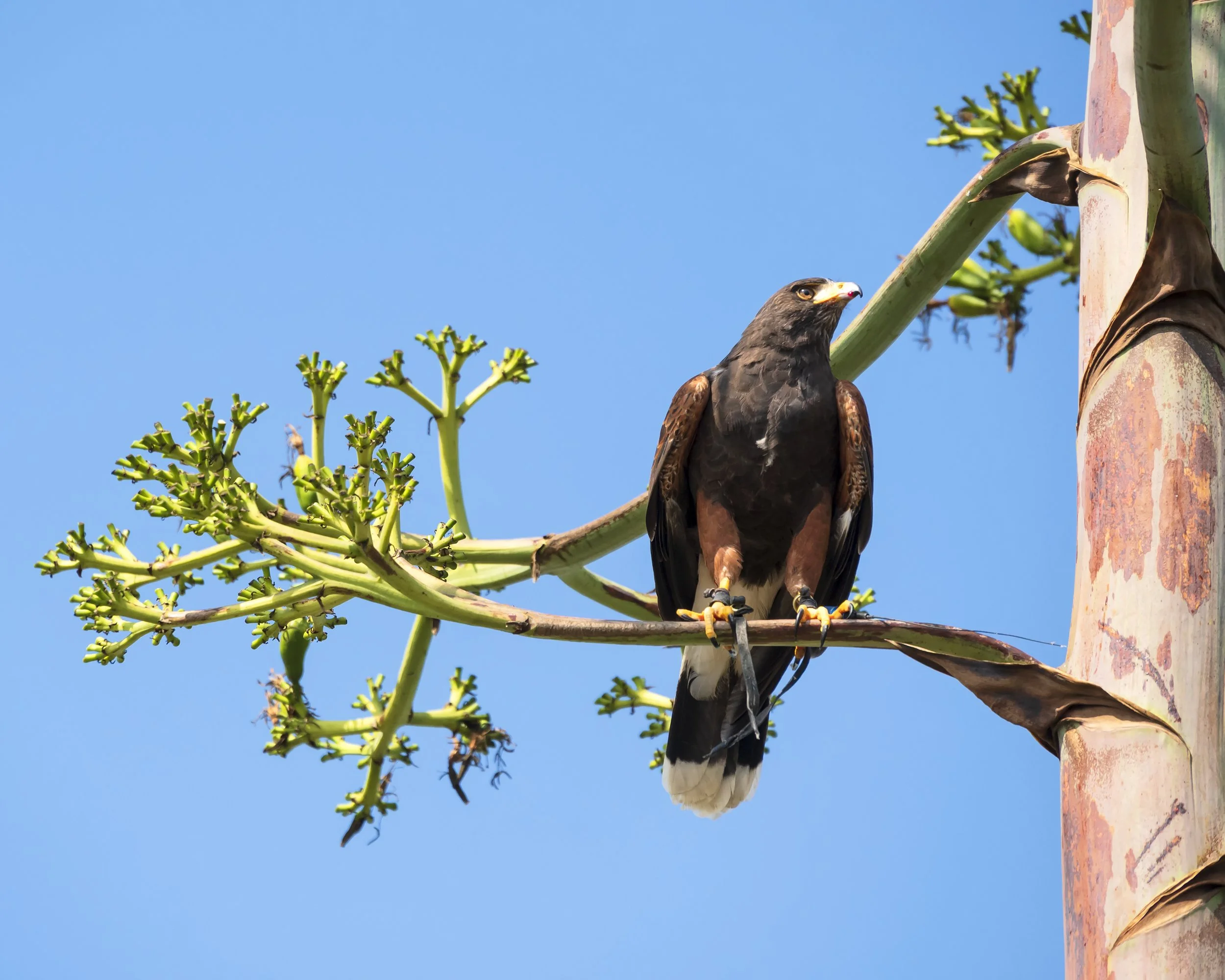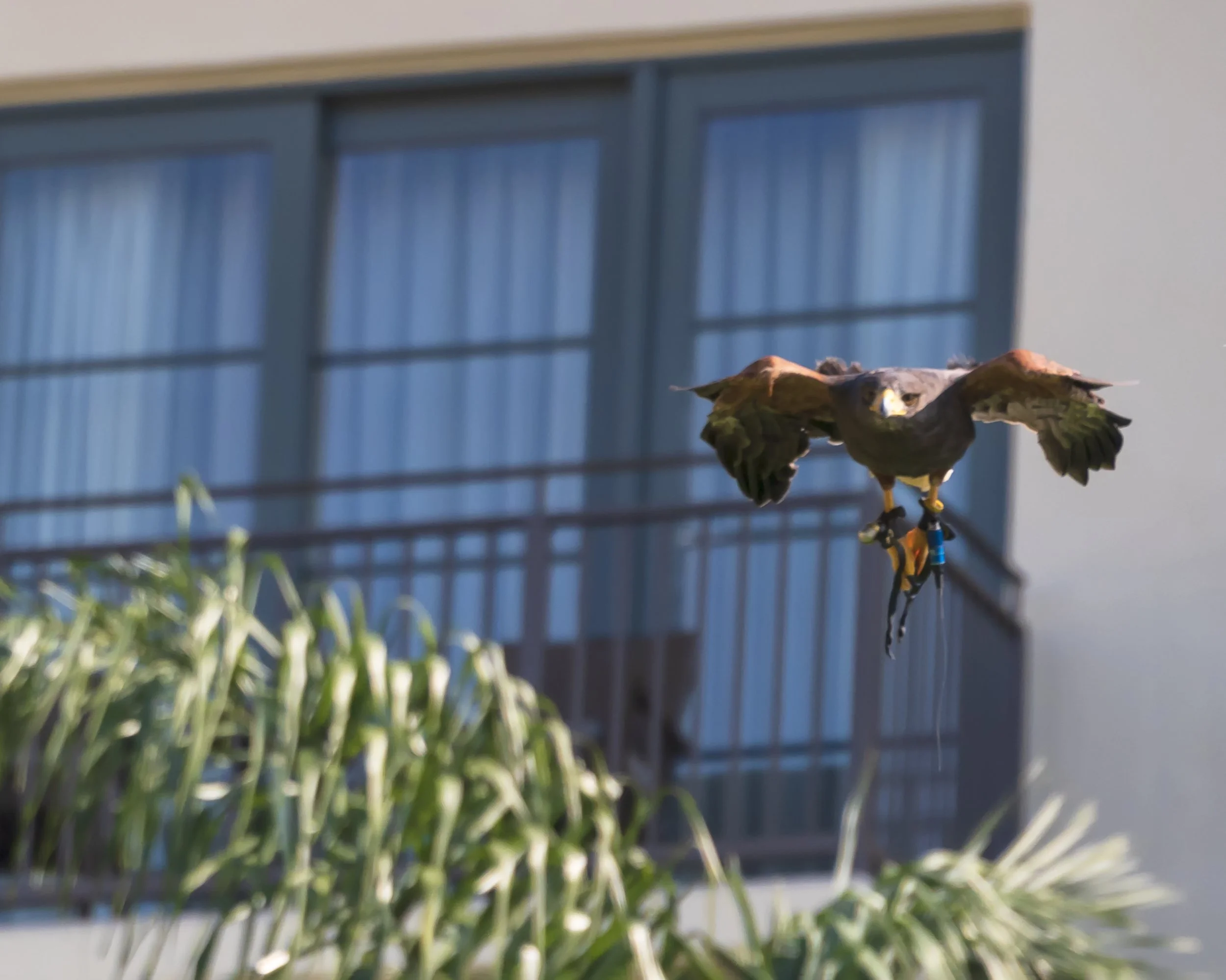 In addition to the falcons, Roy uses a Harris Hawk to assist removing unwanted birds from the rooftops, balconies, and other areas of the Resort. Unlike the falcons, Roy freely walks about the property including the lobby and pool area with his hawk. Roy releases the hawk as he strolls through the property. The goal is to have the hawk reach the rooftop, however, enroute the hawk will stop on balconies, railings, and patios along the way. If the hawk returns to Roy’s hand prior to reaching the rooftop, the reward is withheld. If the hawk reaches the rooftop, it is appropriately rewarded with a tasty treat. Like the falcons, the hawk’s presence is motivation alone for the unwanted winged guests to vacate the property and look for other accommodations.