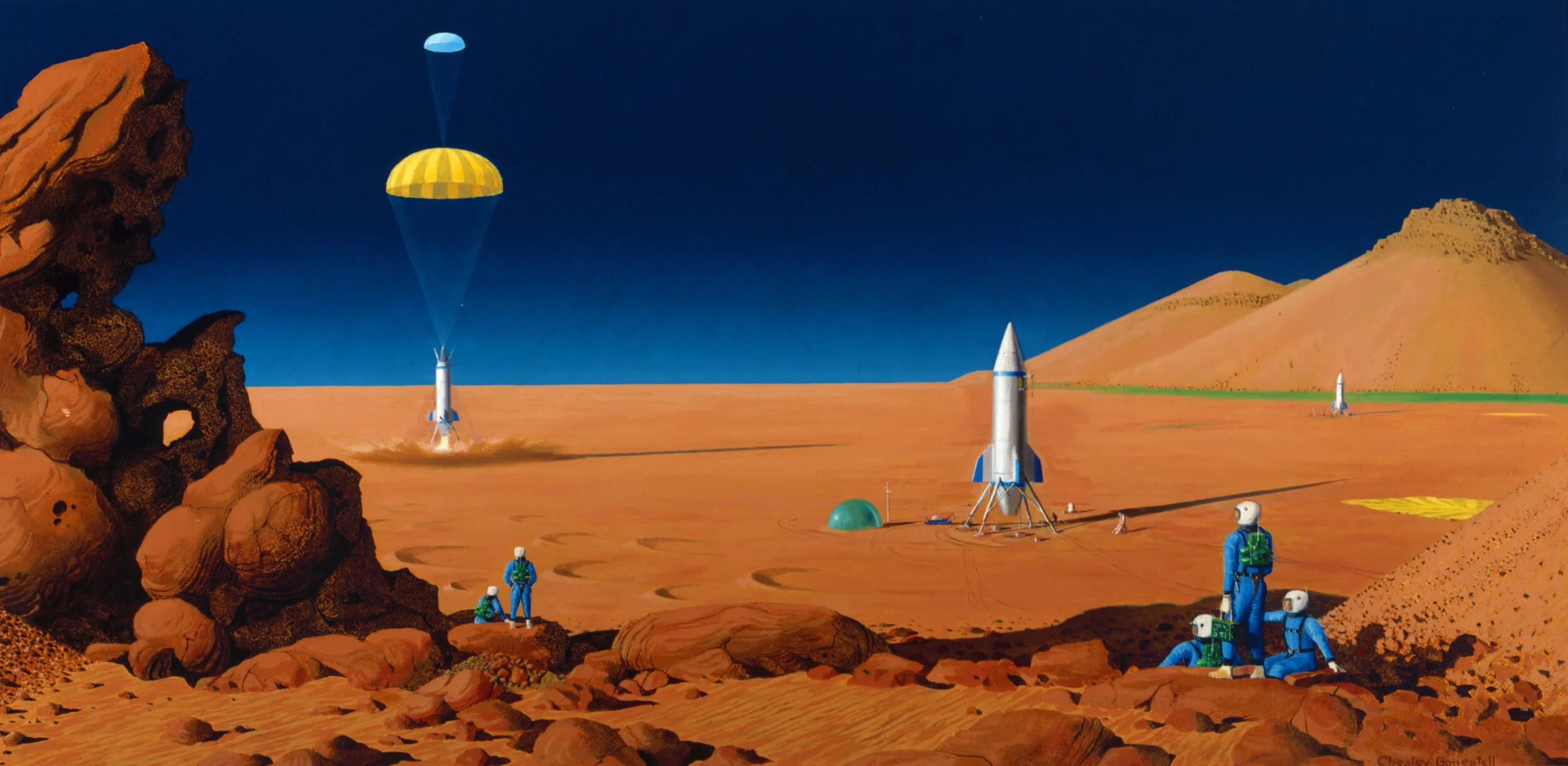 Chesley also saw parachutes being used to bring in supplies to the Red Planet when he painted this scene below almost 60 years ago.