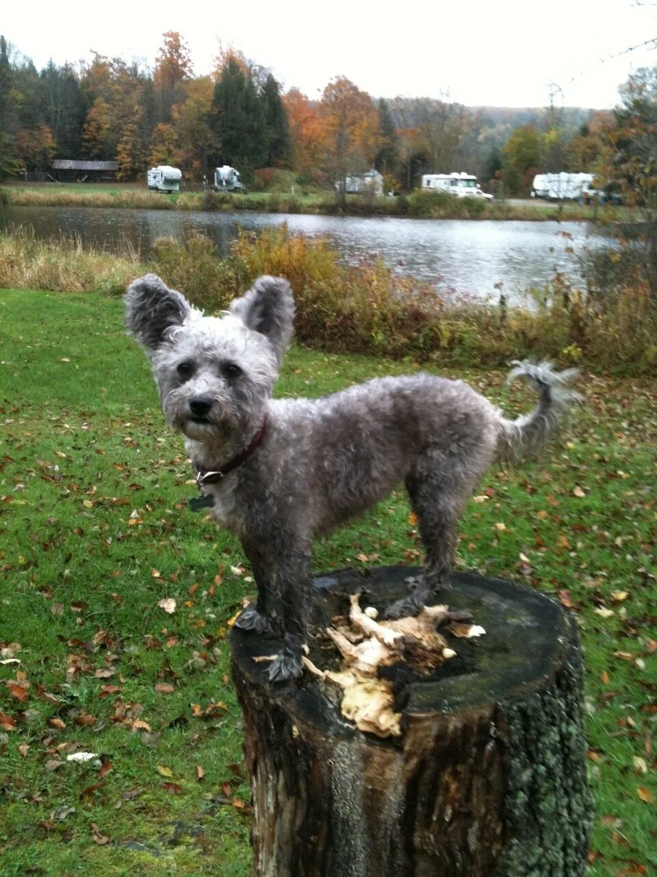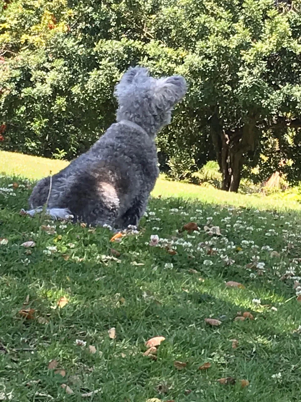 Her silky soft curls and intermittent wiry-like hair are both non shedding. Even if she’s rolls in the grass, or “in the stinky” as I call it, she seldom has a doggy aroma. And oh, those big ears. Round tufts of soft fur hides the pointy dark gray ears beneath, but the fur still grows out rounded all by itself.