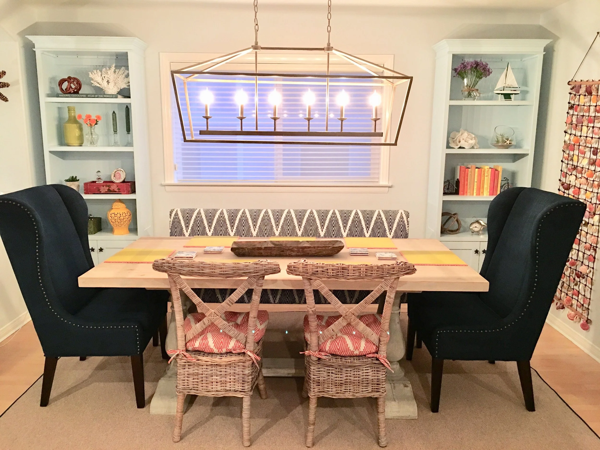 In the dining room pictured below we chose to mix and match different seating options in differing colors and styles to add a fun, eclectic feel to this dining area.