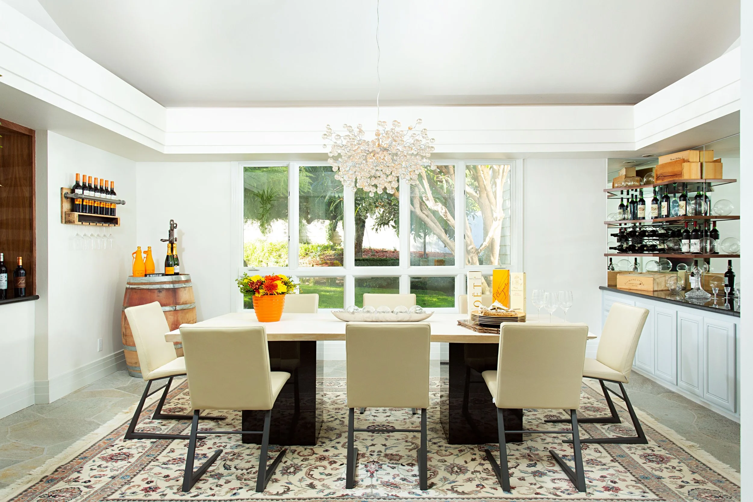 In the second dining room pictured below, we used the rug to add a pop of color and tied that in with chairs in a similar color to make this space feel intentional and cohesive.