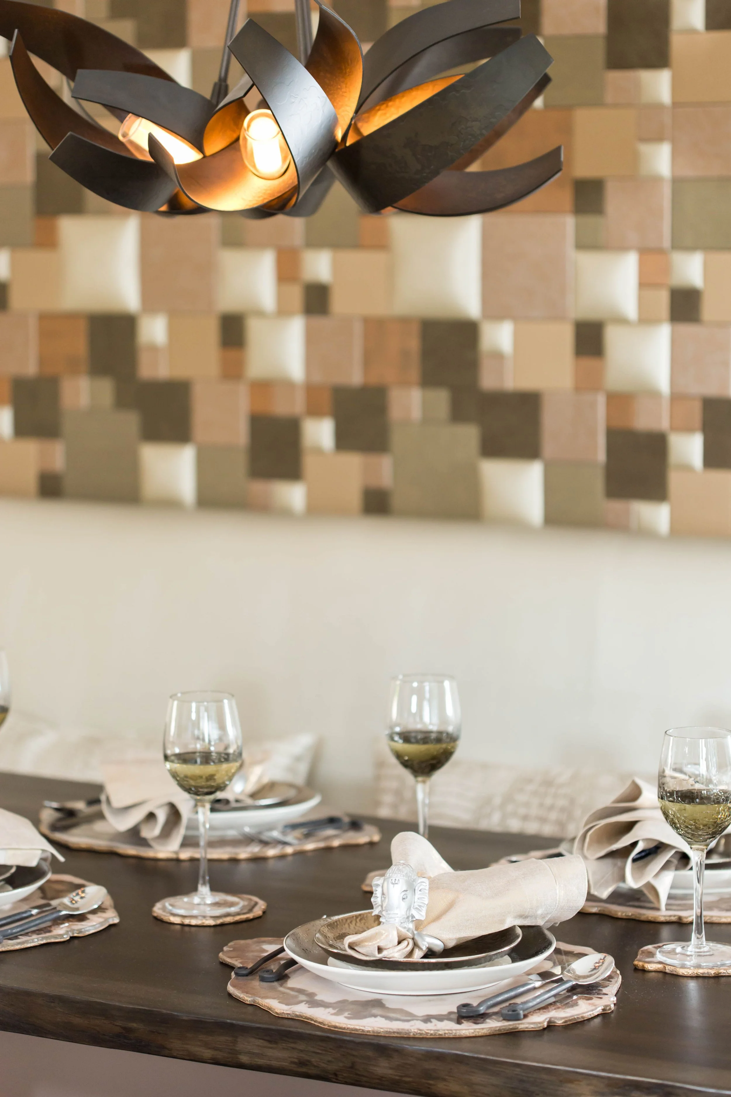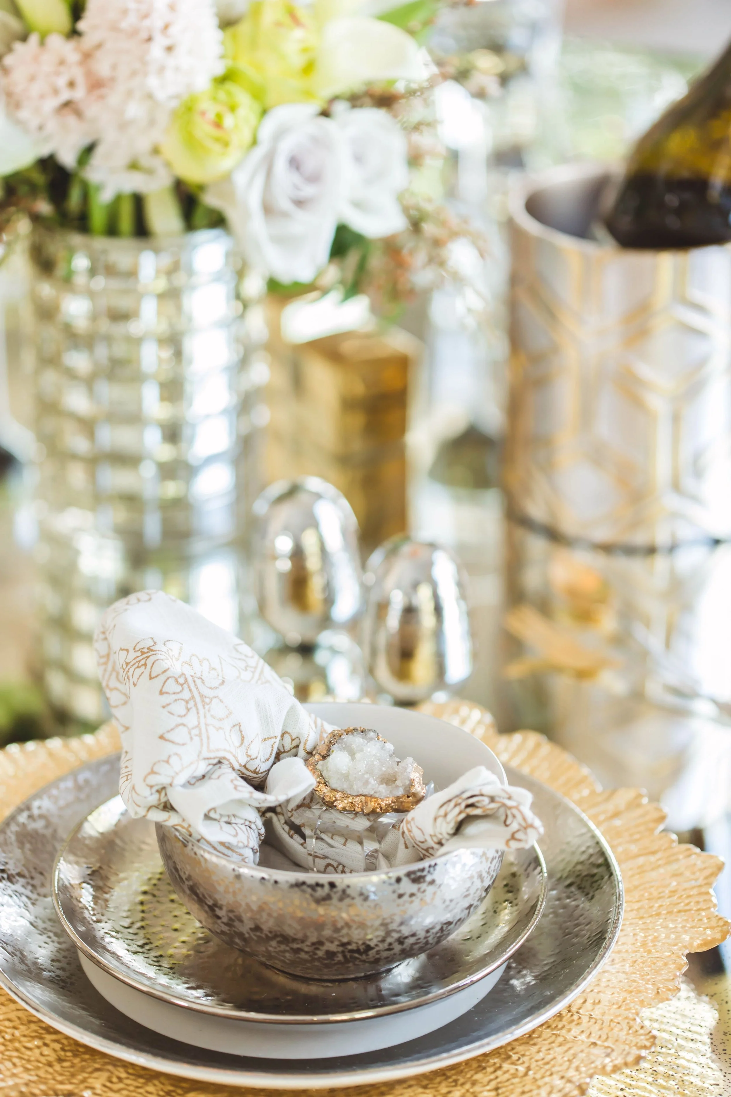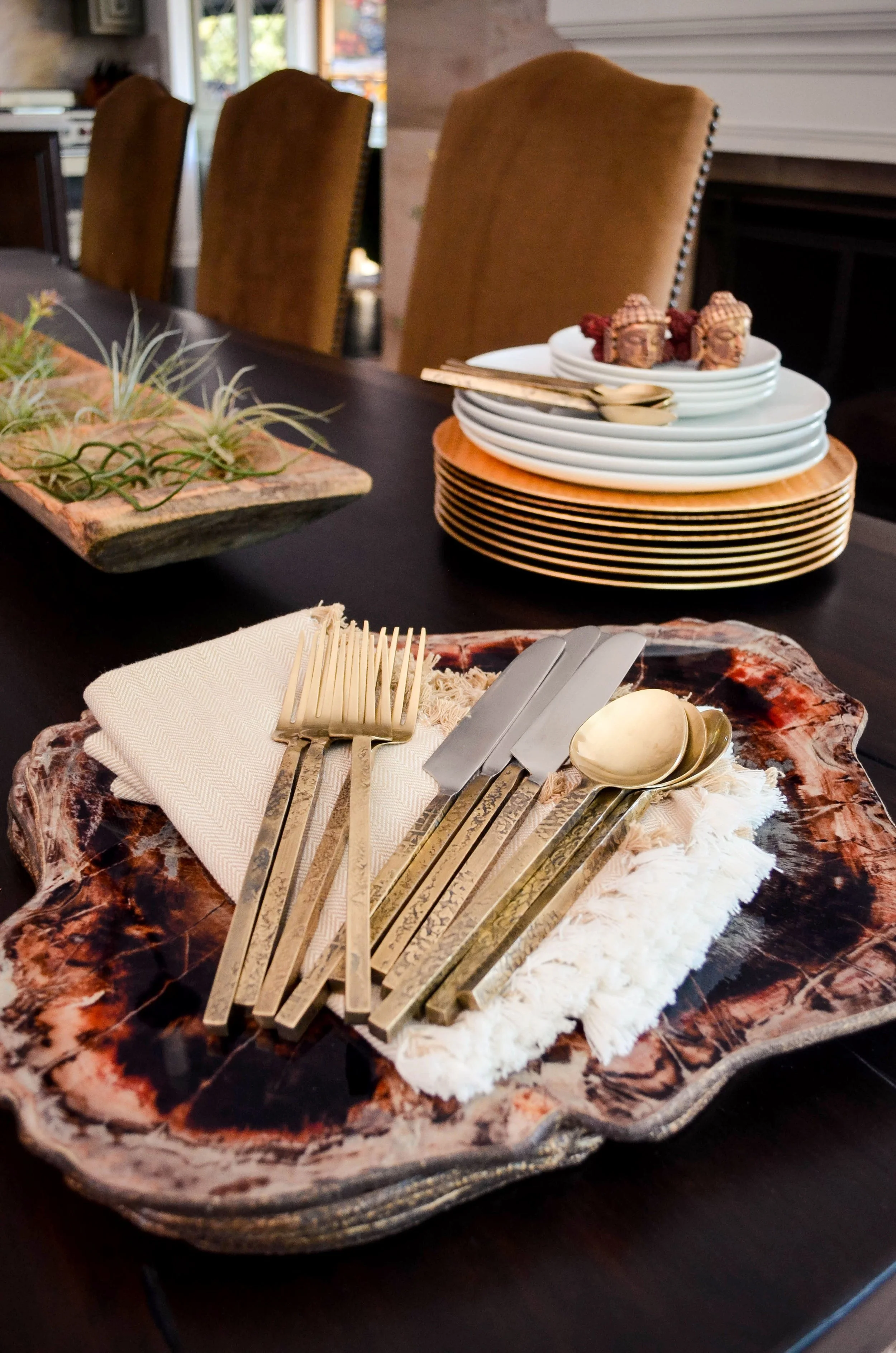 Set The Scene - Before your meal even begins, you want to create an elegant and inviting table setting. Napkins, cutlery, plates, and placemats all play a role in creating a stylish and functional tablescape. Metallics are a go to for me because they work very much like a neutral in a table setting and can easily compliment any style, pattern, or color scheme for max usability.