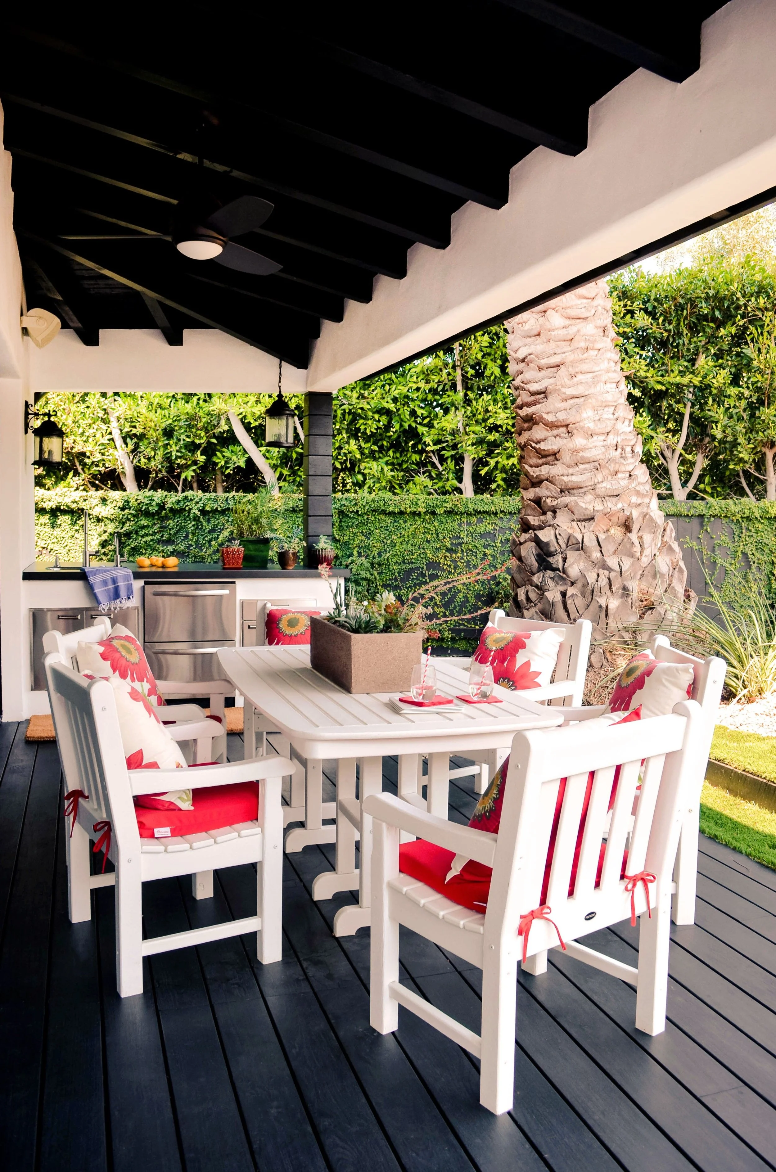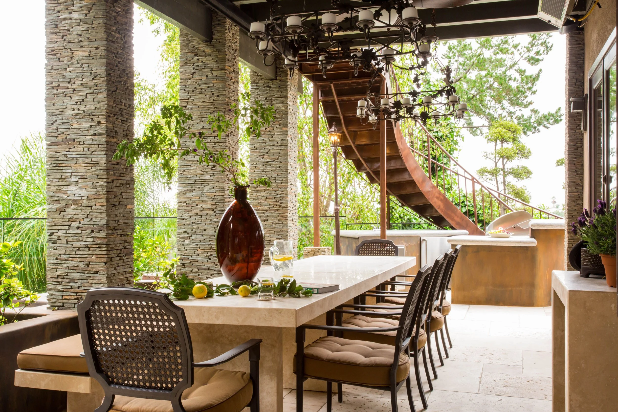 Climate and surrounding environment will of course impact your design choices. I always remind homeowners to choose materials that will withstand harsh UV light as well as rain or snow where appropriate. Furniture should be moisture resistant and non-rusting. Thinking about these things from the very beginning of a design project will give your outdoor dining area longevity and save you from headaches later.