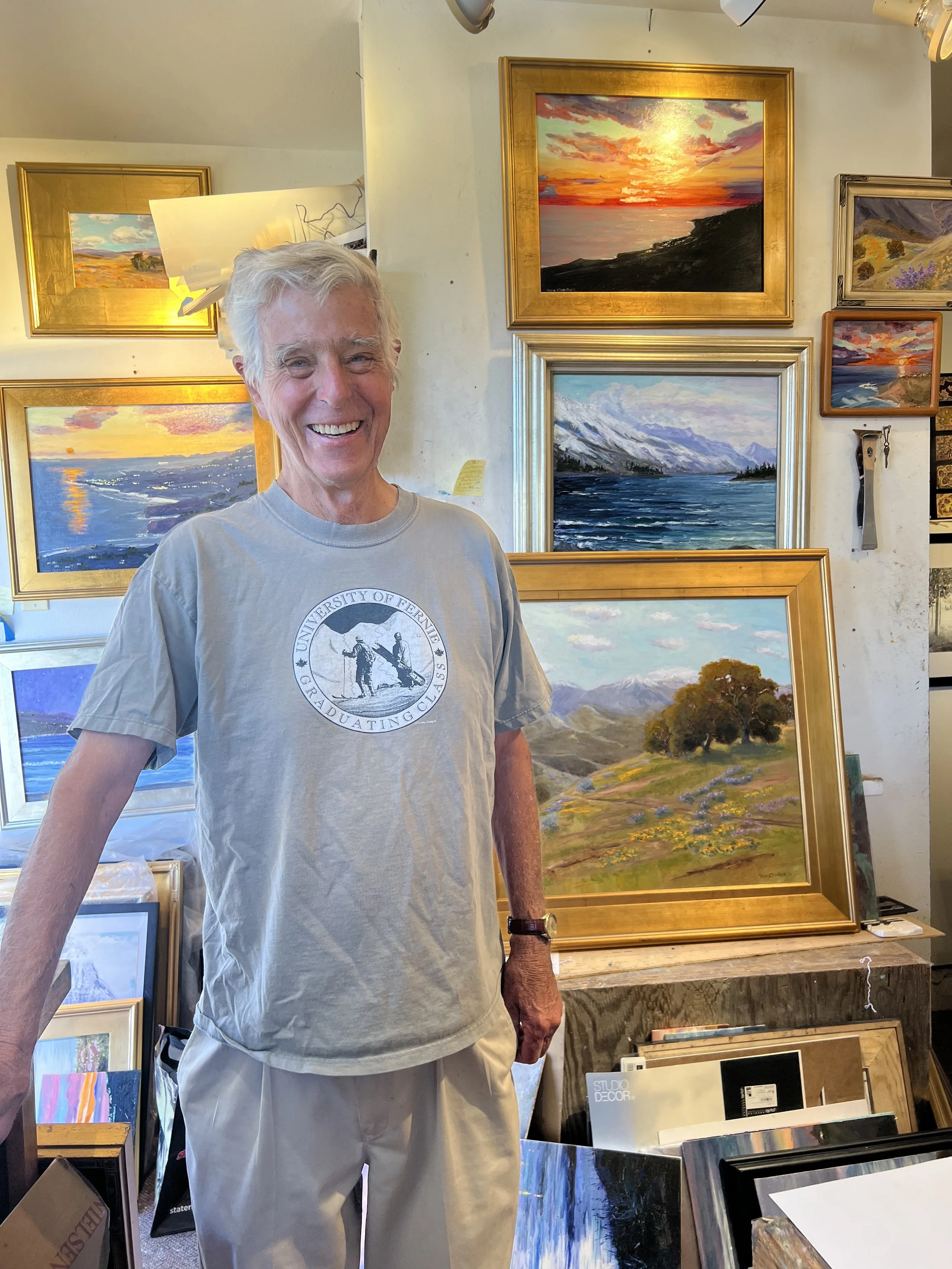 Although he didn’t plan a career as an artist when he bought his beautiful property in 1972, it’s ideal for plein-air painting with its sweeping view of the coastline and the glittering Pacific Ocean below. His favorite time to paint is early in the morning, before 10 am, and in the evening: “Several hours before sunset, through sunset, when the fog is coming in, and into the night with the lights from Golden Cove. I love to paint lights.”