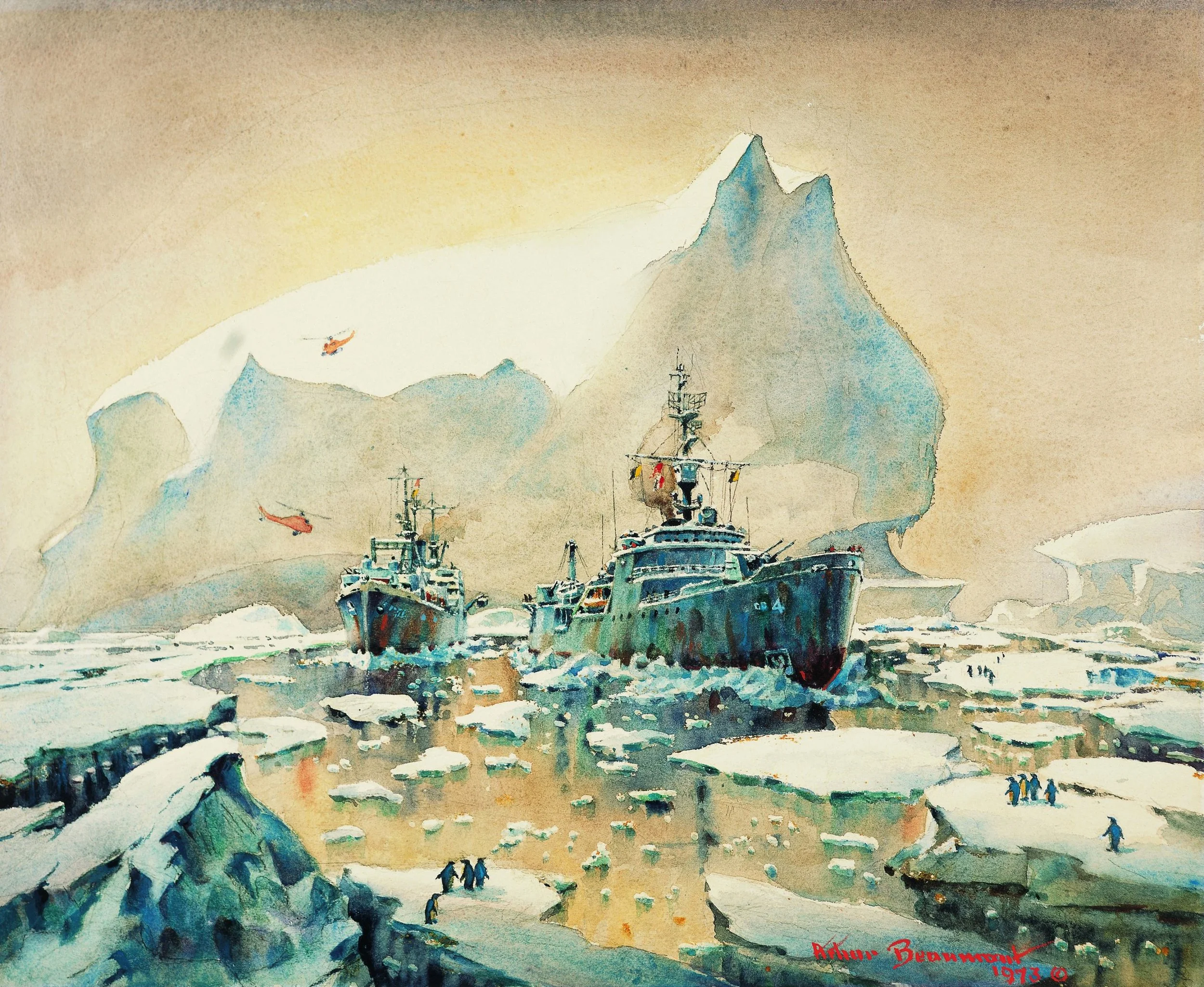 While on assignment to Antartica in 1973, Beaumont painted the icebreaker USS Glacier and the attack cargo ship USS Arneb. It was during this time that Beaumont permanently injured his right arm while being rescued from a fall, and as a result taught himself to paint with his left hand. (Watercolor, Los Angeles Maritime Museum Collection)