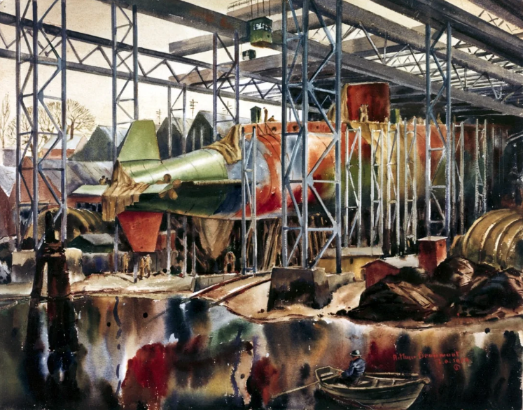 As the Navy's official artist, Beaumont enjoyed VIP access to events such as the Groton, Connecticut launch of USS Nautilus, the country's first nuclear-powered submarine. Due to security concerns, tarps covered most of the hull, so Beaumont sketched from a launch in the Thames River. He later completed the painting in his Los Angeles studio. The painting was originally gifted to Mamie Eisenhower, wife of President Dwight D. Eisenhower. (Watercolor: US Naval History and Heritage Command)
