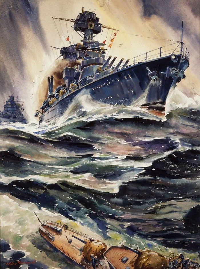 The USS Maryland and the USS New Mexico form the "backbone of sea power" in this watercolor from the collection of the Irvine Museum.