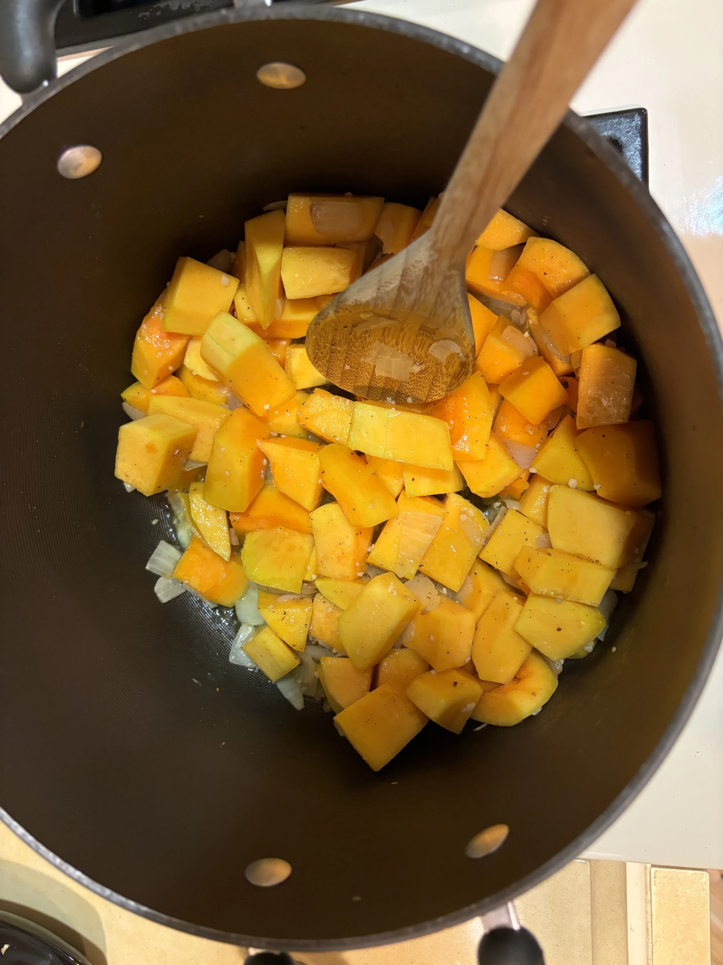 Add the cubed butternut squash and sage to the mixture and cook it for about 5 minutes. The squash should start to soften.