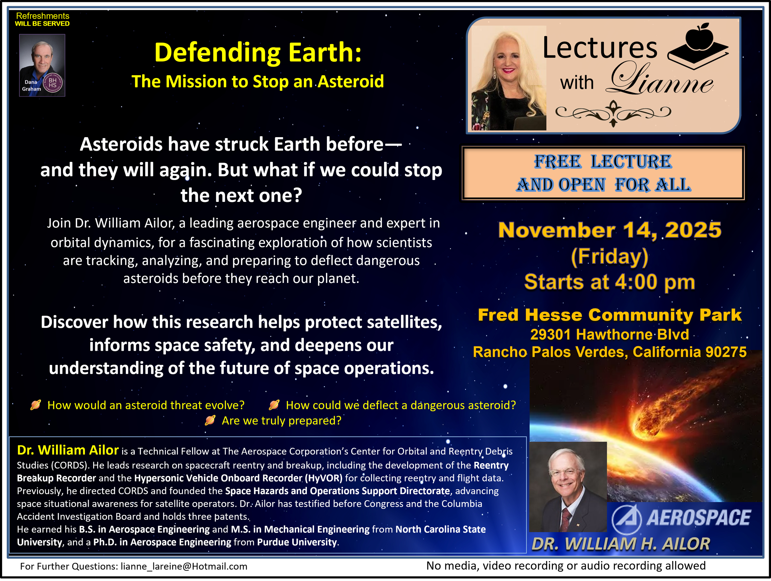 Defending Earth: The Mission to Stop An Astroid with Dr. William Ailor ~ Lectures with Lianne Presents a FREE Lecture November 14, 2025