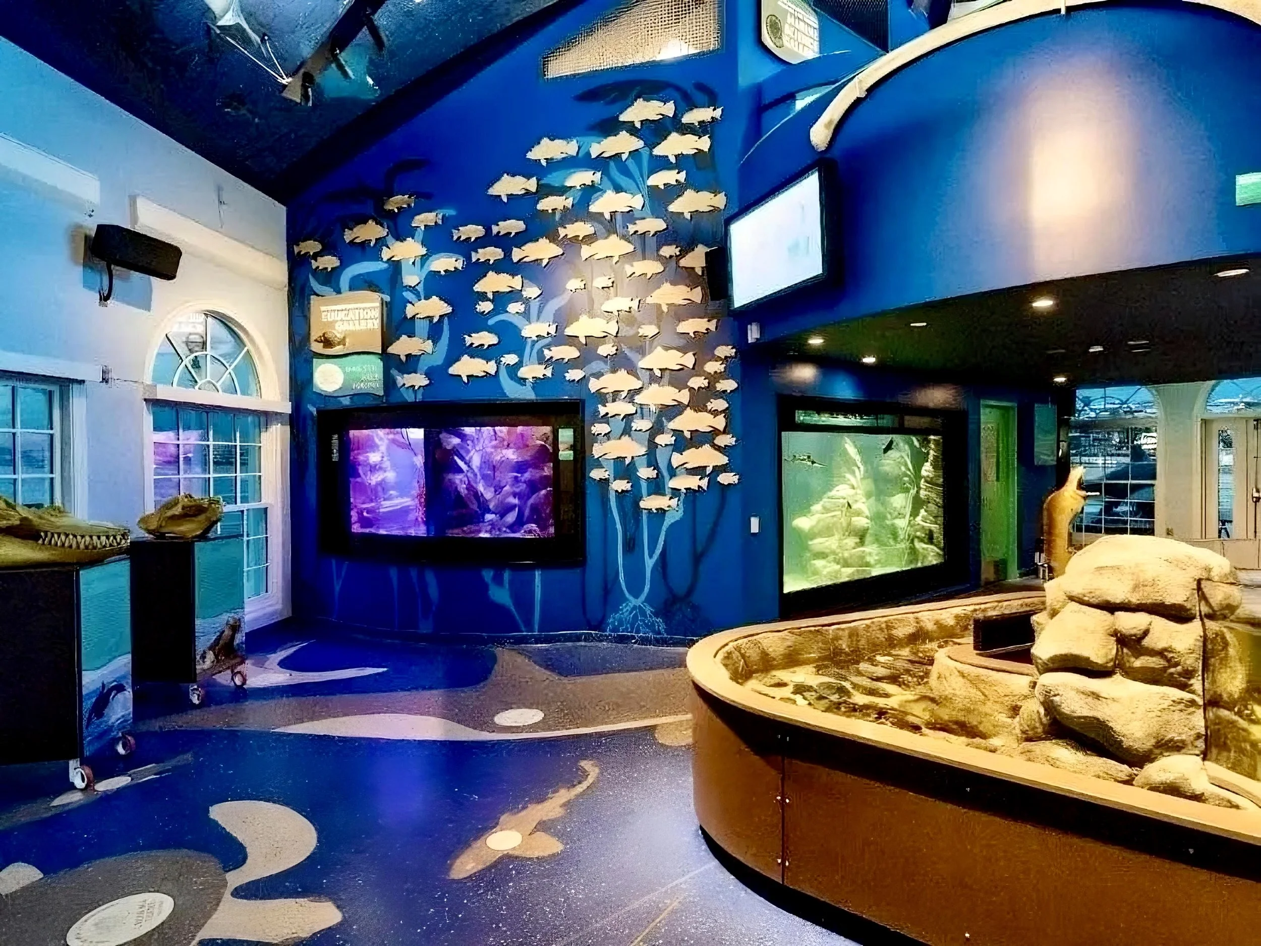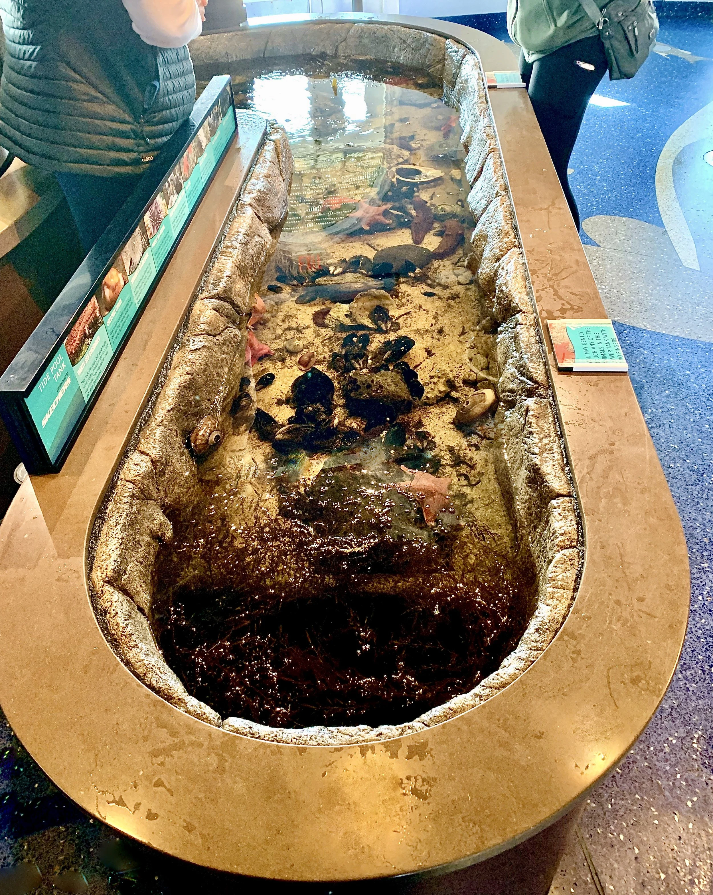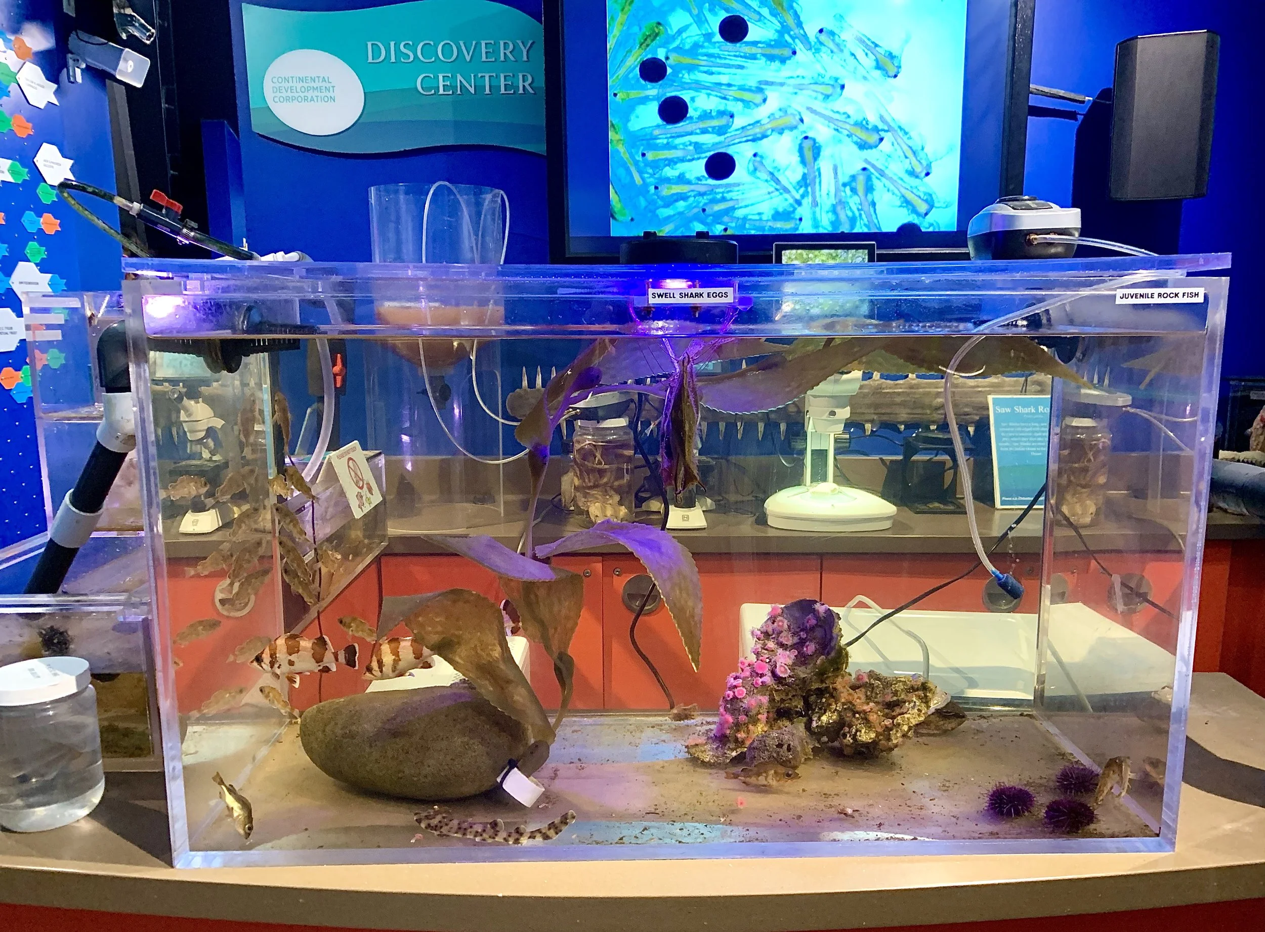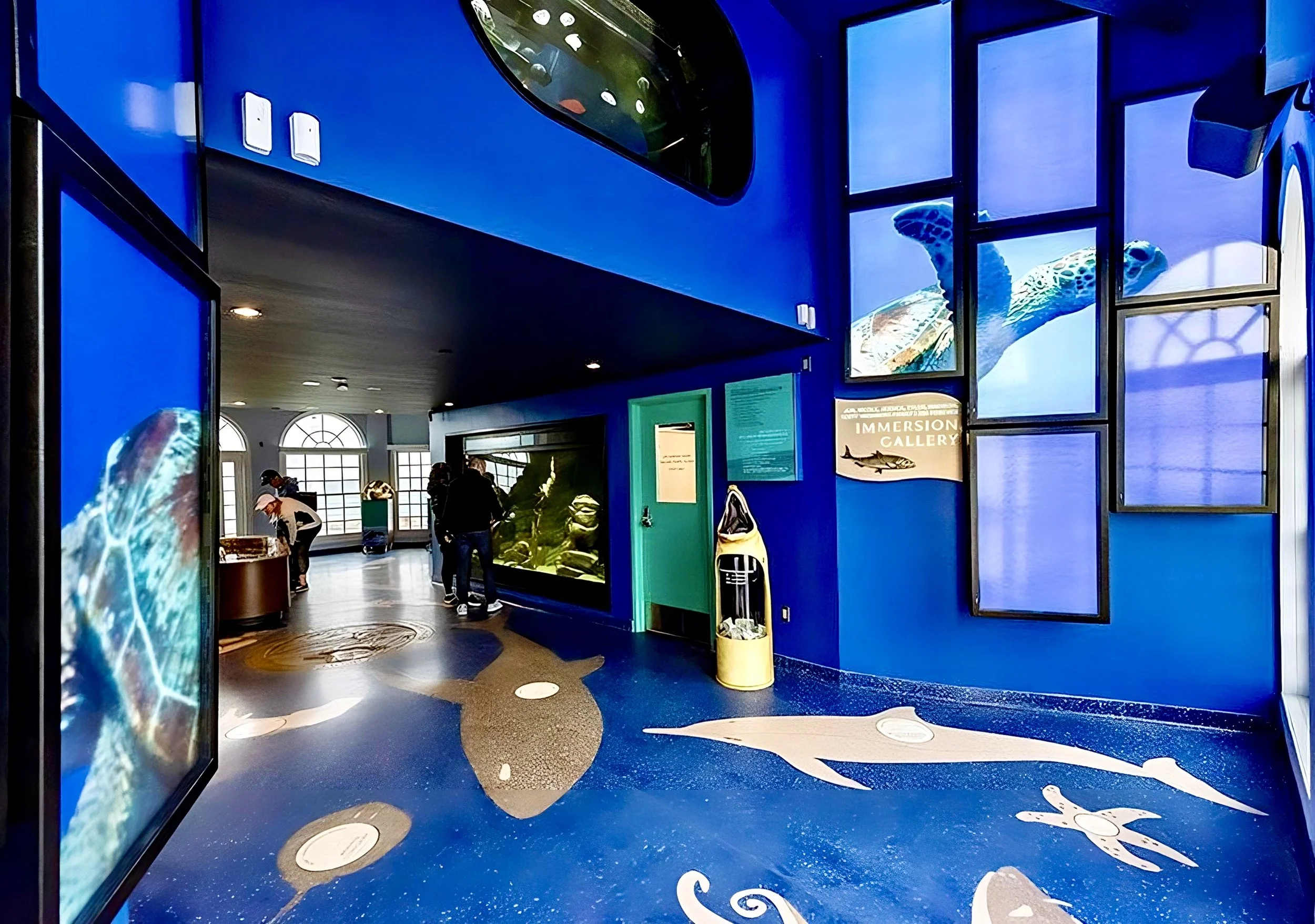 There are four main galleries in the Roundhouse Aquarium — a marine habitat gallery, an education gallery, a marine science gallery and an immersion gallery. The marine habitat gallery has a rocky reef tank and a kelp forrest tank. The education gallery has a deep kelp forrest tank, tide pool tank and a pier piling tank. The marine science gallery has an octopus tank, pipefish tank, seahorse tank, jewel tank, artificial reef tank, kids kelp corner and a discovery scientist center. The immersion gallery is an immersive floor-to-ceiling audiovisual experience of the Pacific’s waters.