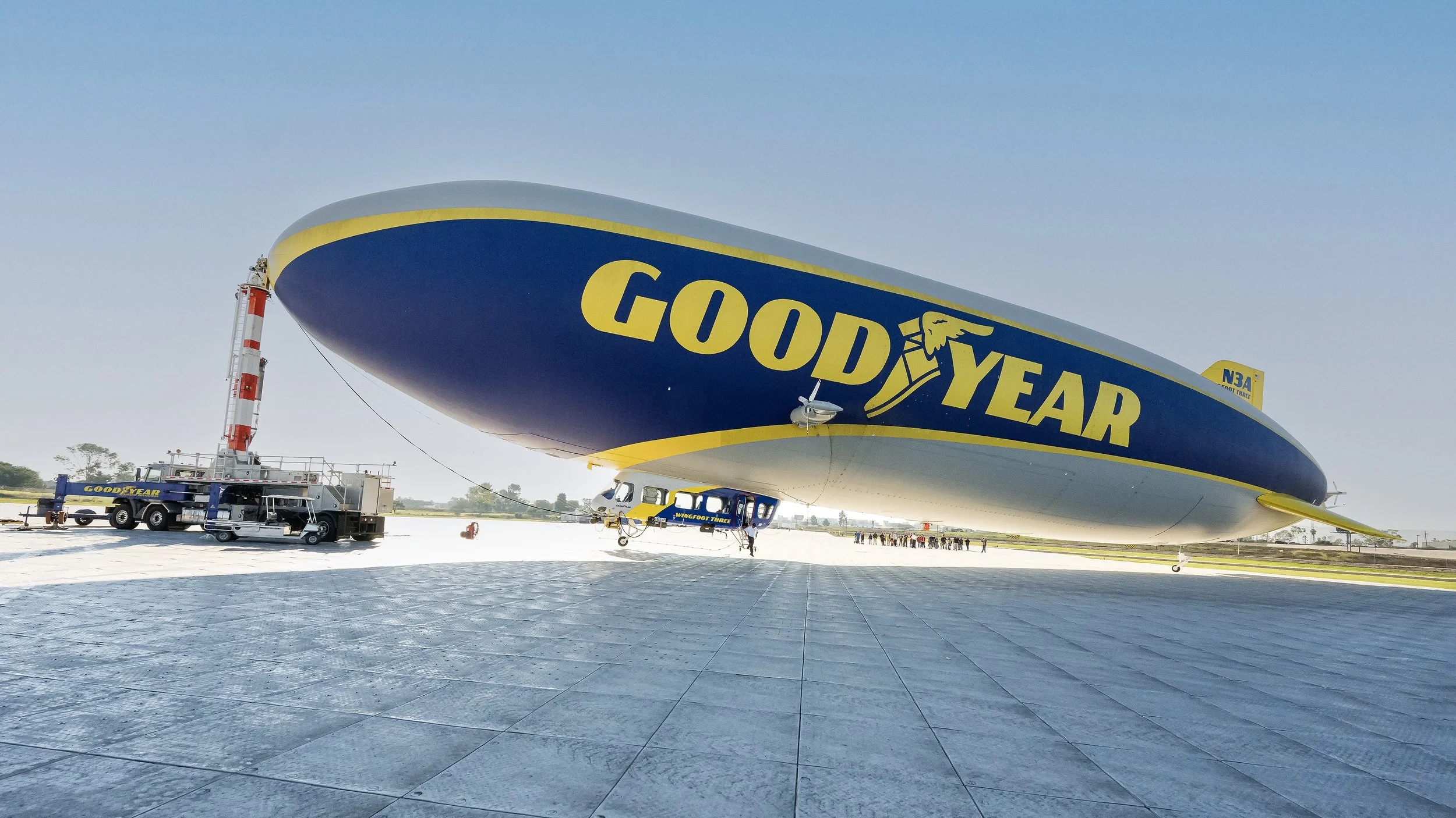 The three Goodyear Airships feature semi-rigid construction. An airframe of aluminum and carbon fiber trusses are constructed inside the envelope and provide stability and shape for the envelope. Also, the airframe provides attachment points for the gondola and the three engines.