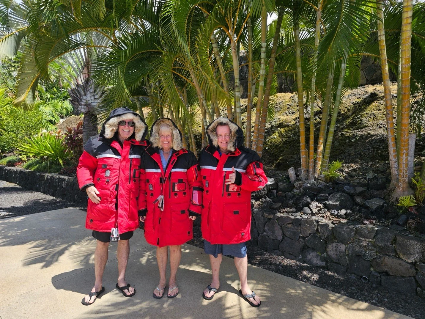 We knew it would be cold. We live in Hawaii now and had no winter clothing. So, we got a recommendation from a friend and bought appropriate gear…lots of layers. Good snow boots. Good gloves. Good face cover. Ice claws for the bottom of the boots…which we only needed in town. And then we went nuts and bought Outdoor Survival Canada heavy jackets and matching snow pants…all good to over sixty below zero conditions. We bought our business partner, C.J. Kale a jacket as well, as he chases the aurora in Alaska and elsewhere usually twice a year. Here we are in my backyard in Hawaii…without the pants. Overkill, maybe, but we were not about to be cold in Yellowstone. Good thing…it was minus 40 degrees when we arrived. Warmed up to minus 22 with lots of snow.