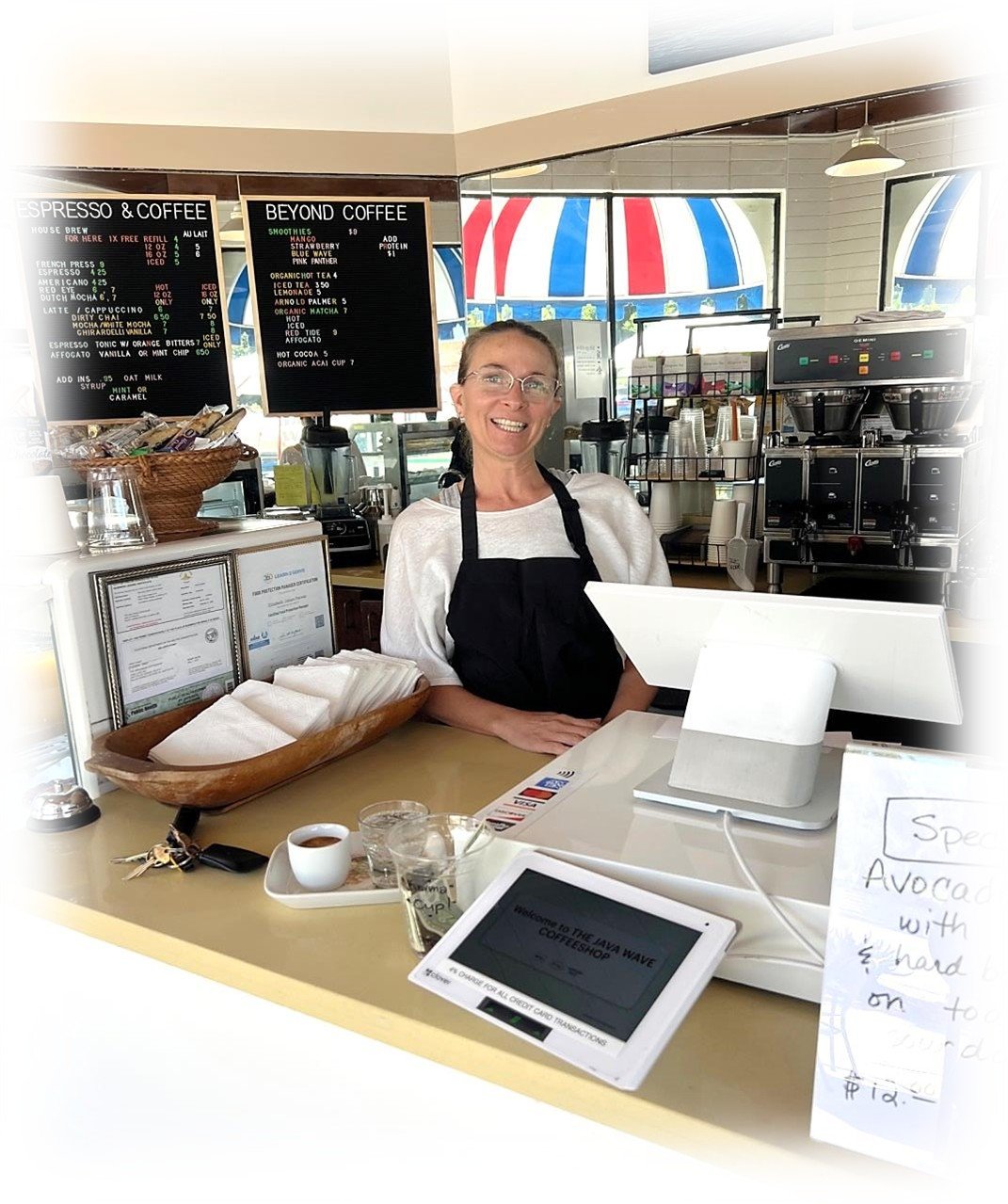 Beth, like most entrepreneurs journeyed through miles of paperwork, permits delays and unexpected financial roadblocks to reach Java Wave’s opening day. Her passion for the project was all consuming, and along with three sons and a husband testing her recipes, her mother Pam has been instrumental in supporting Beth’s entrepreneurial venture. Pam, a talented interior designer developed Java Wave’s coastal-themed outdoor seating plan and decor. Pam added new topiary planters to define the open-air sidewalk patio space and anchored each side of the entry with a deeply cushioned loveseat to provide the ultimate in sipping relaxation. Several faux stone topped metal tables capped by light cream Sunbrella fabric umbrellas complete Java Wave’s fresh new inviting look. Pam sets out on the road before the sun rises to gather up and transport freshly baked pastries back to Java Wave. Beth says, “I really could not do it without her.”