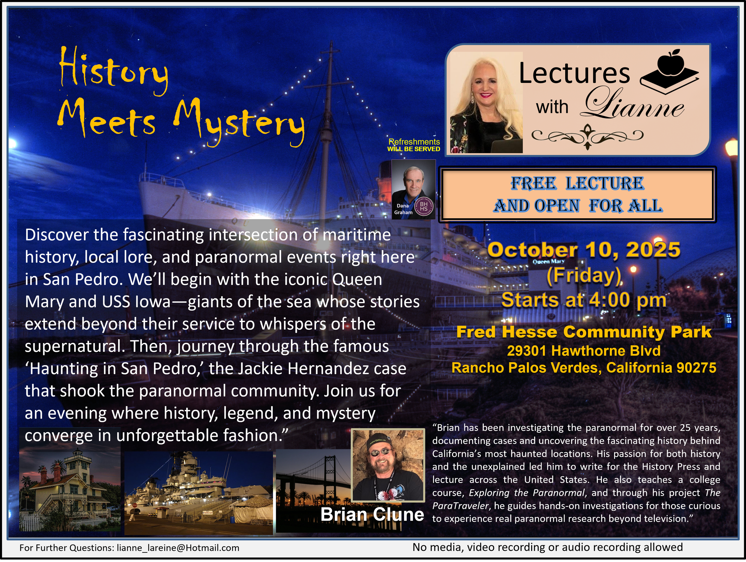 Lectures with Lianne Presents a FREE Lecture on October 10, 2025 - History Meets Mystery with Paranormal Expert Brian Clune Lectures with Lianne Presents a FREE Lecture on October 10, 2025 - History Meets Mystery with Brian Clune SUBSCRIBE FREE TO PALOS VERDES PULSE Events - Fêtes- SoiréesPalos Verdes Pulse InfluencerSeptember 12, 2025 Facebook0 Twitter LinkedIn0 Pinterest0 0 Likes