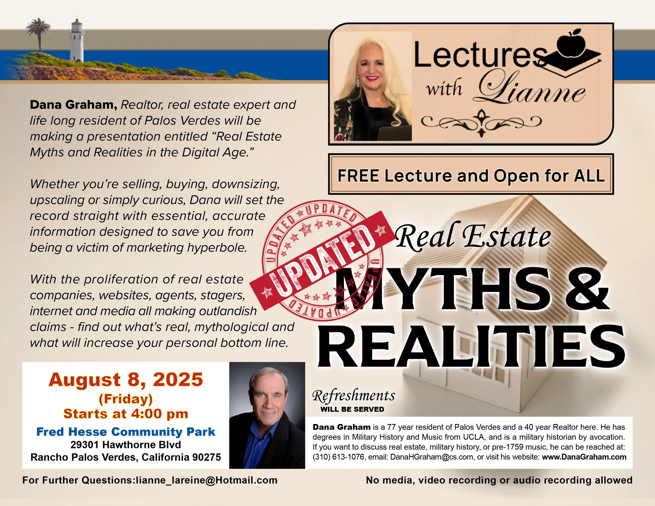 Lectures with Lianne Presents a FREE Lecture on August 8, 2025 - Real Estate Myths & Realities with Real Estate Expert Dana Graham Lectures with Lianne Presents a FREE Lecture on august 8, 2025 - real estate myths & realities with real estate expert Dana Graham Events - Fêtes- SoiréesPalos Verdes Pulse InfluencerJuly 26, 2025 Facebook0 Twitter LinkedIn0 Pinterest0 0 Likes