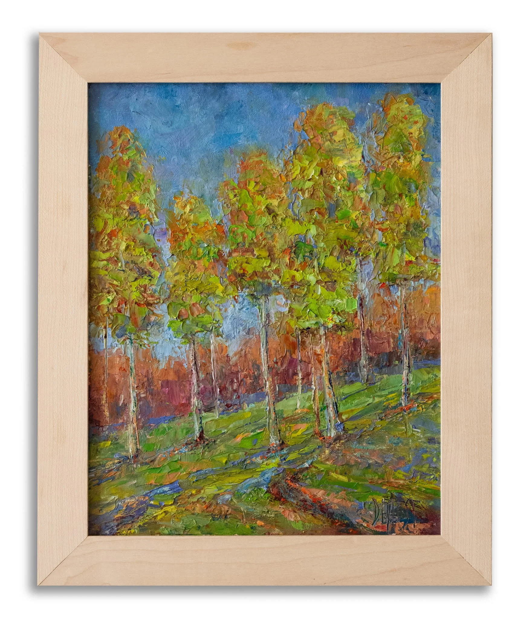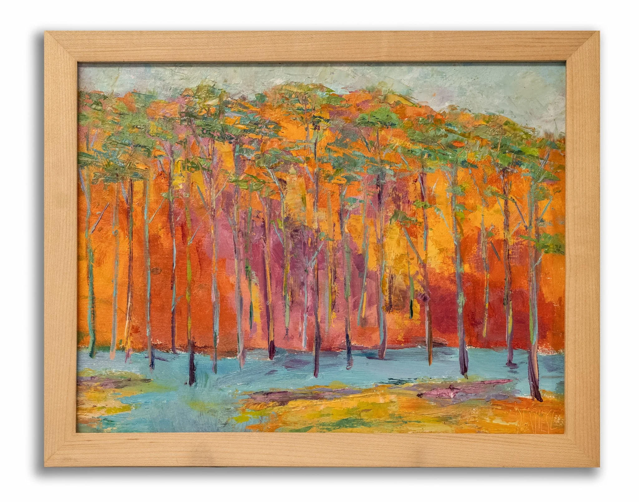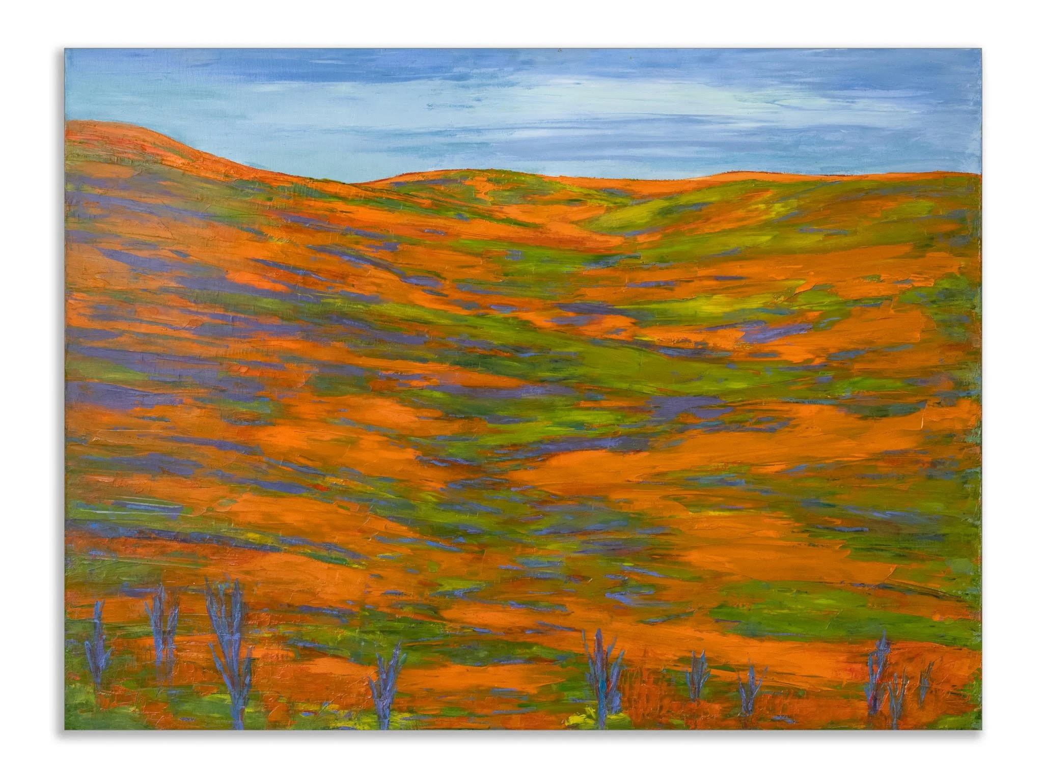 “I just remember looking up this hill, and it's just all orange, with the little spots of green here and there, but not much — little purples with flowers in between. I just took it home, and it was just so into my body. That was my inspiration,” Giese says. It's interesting, because I have other people come in and they say, ‘What do you think it is?’ And people say, ‘Oh, I think it's a desert, or I think it's this, or I think it's that.’ So it can be anybody's interpretation, but for me, it was really clear that it came from just being in total awe after going to see the poppy fields. When I was painting it, it was just of the feeling that I had about being there and the color that I saw that was there, and all of the vastness of it.”