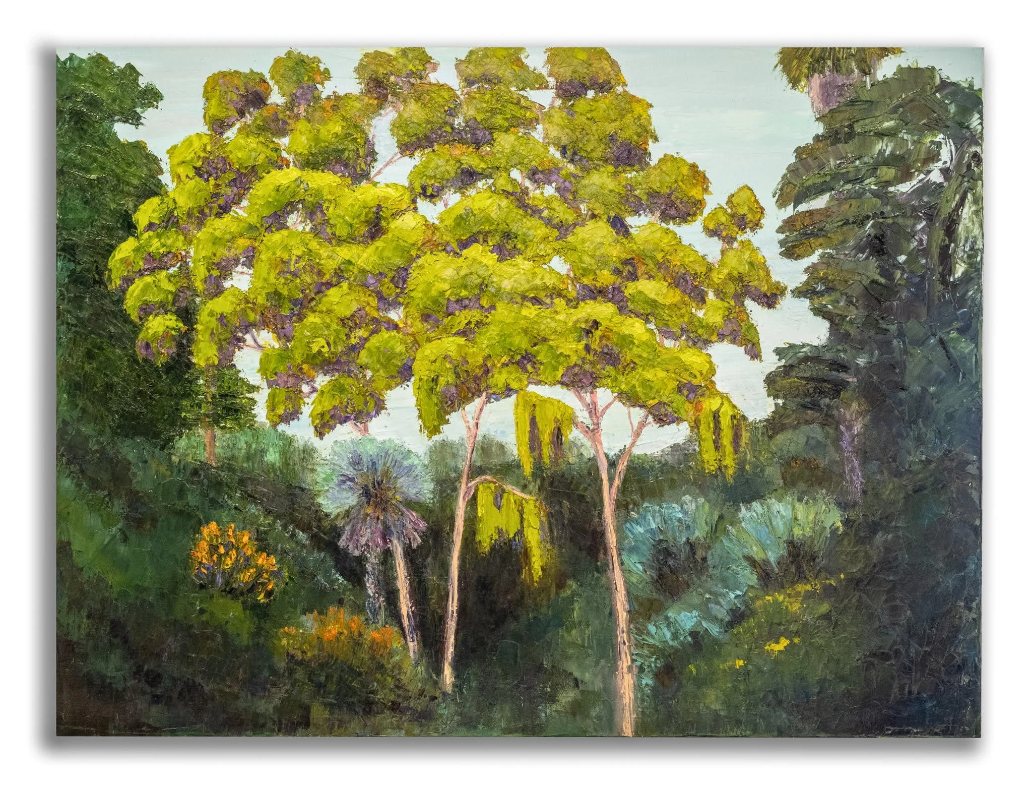 The painting has recently been part of Giese’s display in the “Five Muses” exhibition at the Gallery of Hermosa, which featured art from five women. “Poppy Heaven” is a divergence from some of Giese’s other work — which leans into a more traditional, realist bend — and instead opts for less definition, featuring large swaths of orange intermixed with greens, purples and blues.