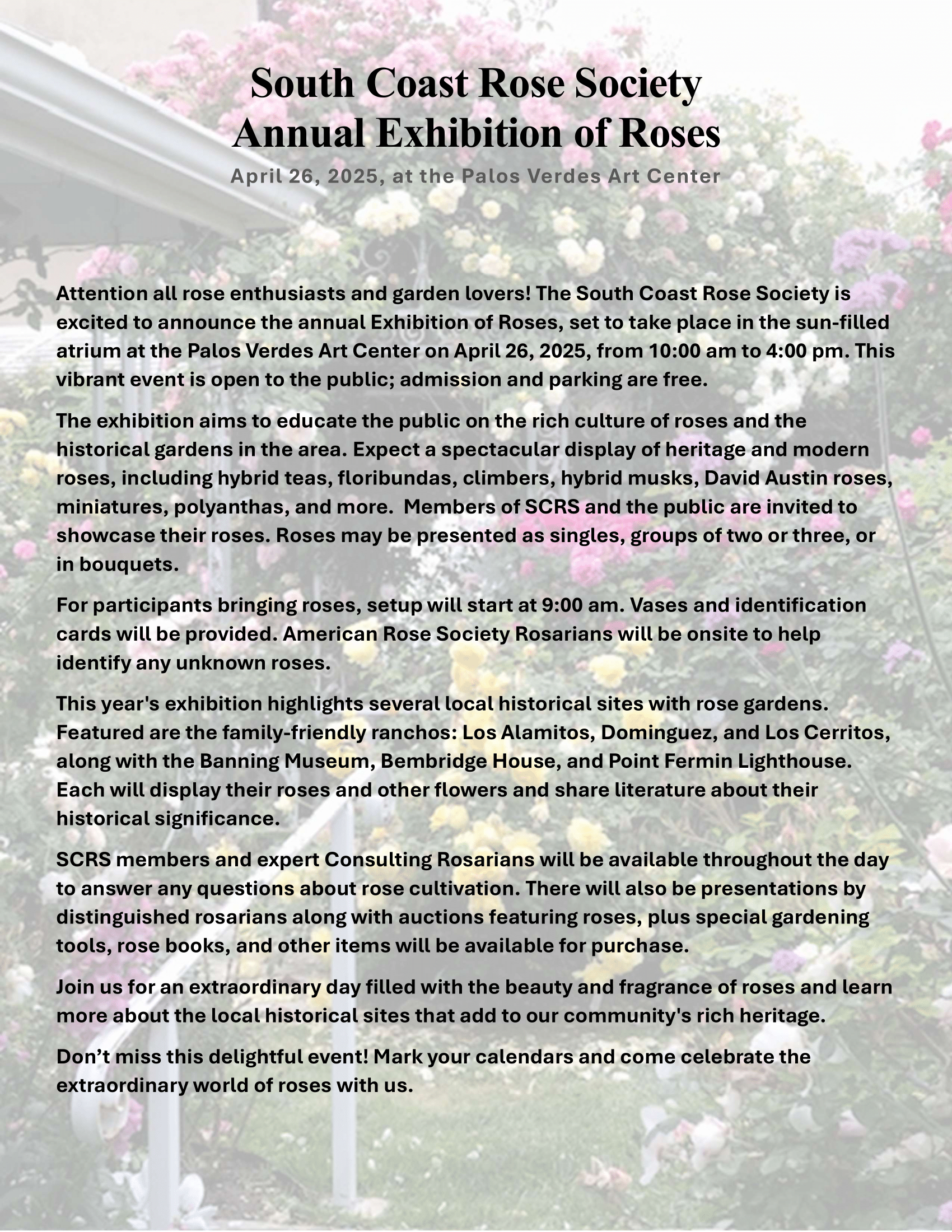South Coast Rose Society Annual Exhibition of Roses SUBSCRIBE FREE TO PALOS VERDES PULSE Events - Fêtes- SoiréesPalos Verdes Pulse InfluencerMarch 30, 2025 Facebook0 Twitter LinkedIn0 Pinterest0 0 Likes