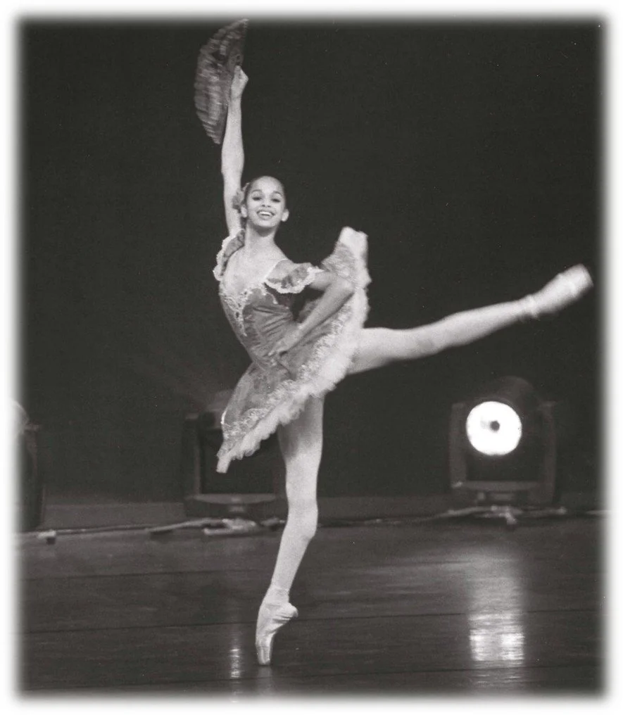 Cindy started a free class at the Boys and Girls Club Gym and invited a tiny girl sitting alone on the back bleacher to join the ballet class. It took weeks until this shy child climbed down and joined the class. Misty Copeland had no ballet training, was 13 years old and stood 4’10’’ and weighed 65 pounds when she took her first ballet class.