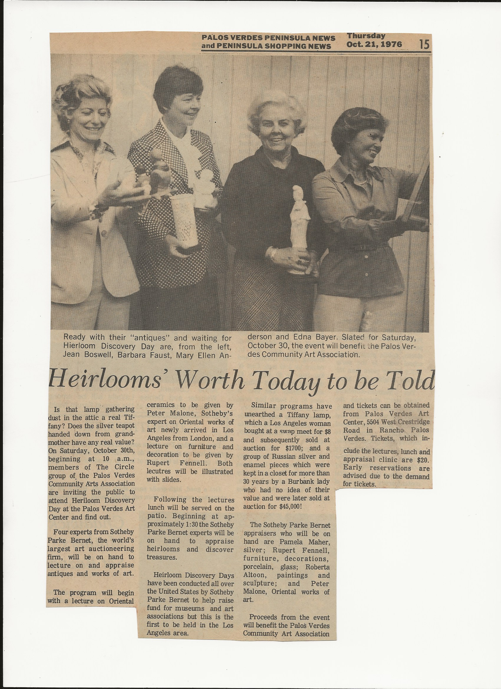 For the past 50 years, The Circle has held fundraisers to support the Palos Verdes Art Center (PVAC). In 1975, the organization started with 85 women, whose first fundraiser was to sell cookware in a parking lot, which netted them $2,000. Then, they raised more funds among themselves to reach a grand total of $11,000 to give to the PVAC that first year.