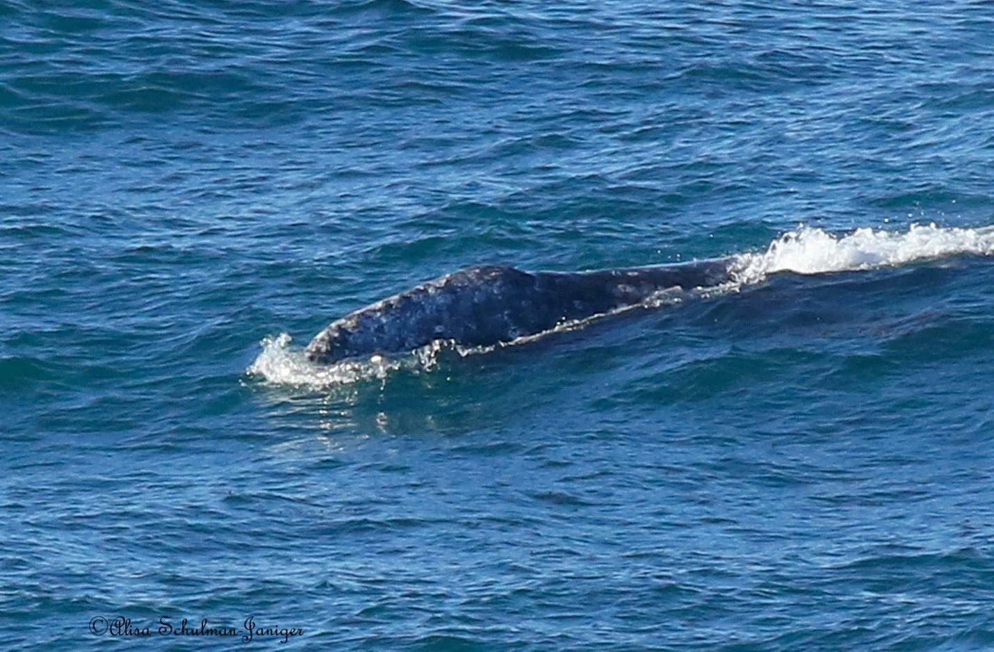 Schulman-Janiger states that after 41 years of the Census, she caught this one-time-only event: “ I saw two northbound gray whales and one southbound gray whale and they were passing, and it was almost at the end of the observation area close to the point on this cliff, the northbound stopped right before the cliff at Whale Rock, the southbound stopped right before the cliff, there was a giant wave and all three whales got on that wave… then the southbound continued south, and the northbound continued northbound, so that was a really cool interaction. We watched the southbound whale for nearly two hours; it milled a long time before reaching us. It had healed entanglement scars at the base of its flukes.”