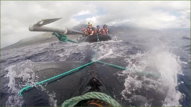 Entanglement responders use a nearly life-size whale tail model to develop and hone skills required for on-water responses to entangled large whales. Credit: Ed Lyman/NOAA